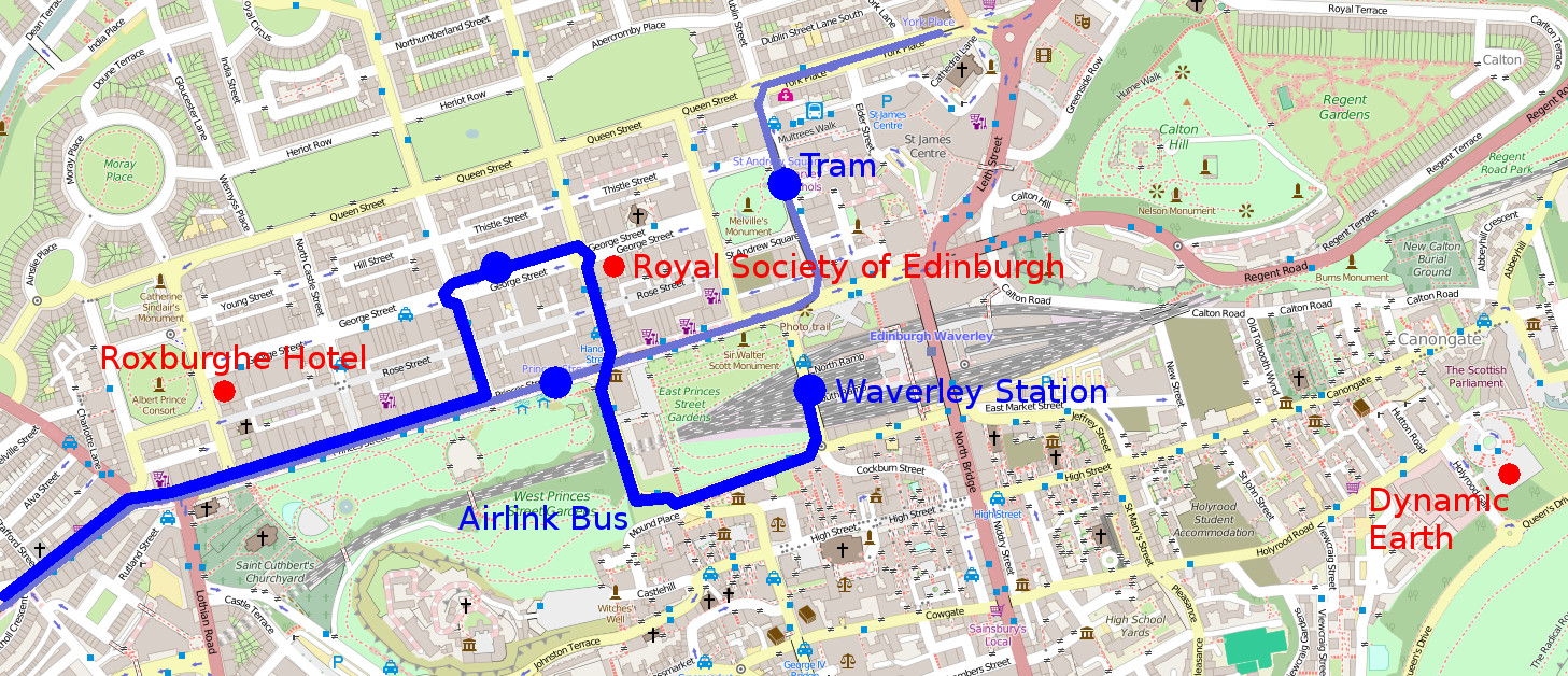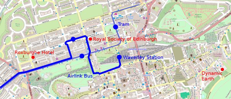 The Royal Society of Edinburgh (Mon&Tue) in 22-26 George Street is within walking distance of Waverley railway station (ca 300m). The building isn't well-signed, it is easier to spot the Hard Rock Cafe next door. From the airport, the fastest and easiest option is the Airlink bus (ca 25 minutes journey time); it stops in George Street ca 100m west of the Royal Society. Alternatively, the tram takes about 35 minutes from the airport; get off on St Andrews Square and walk through the garden to George St. (ca 200m). Taxis are usually only marginally faster.